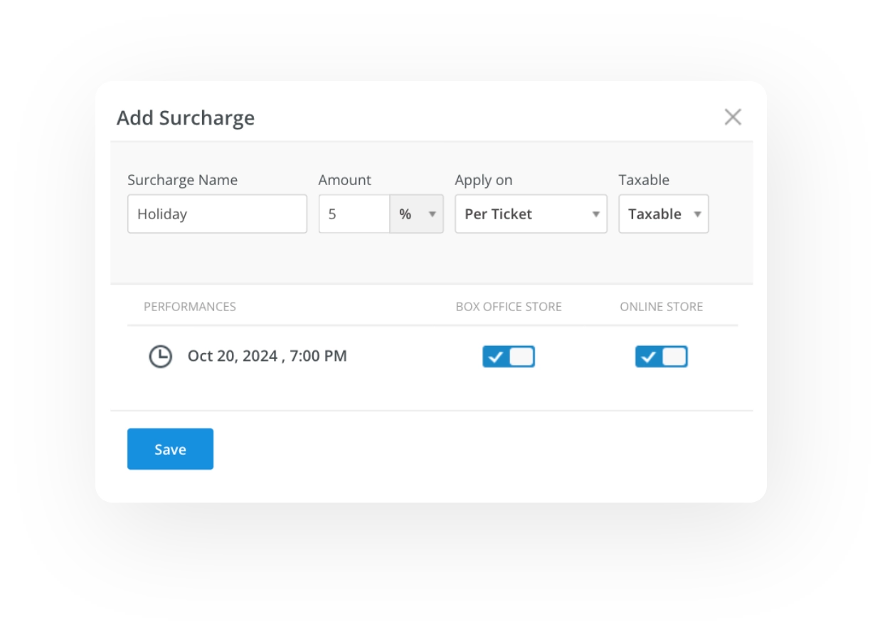 Add surcharges to tickets for additional costs such as booking fees or taxes, ensuring all fees are accounted for upfront.