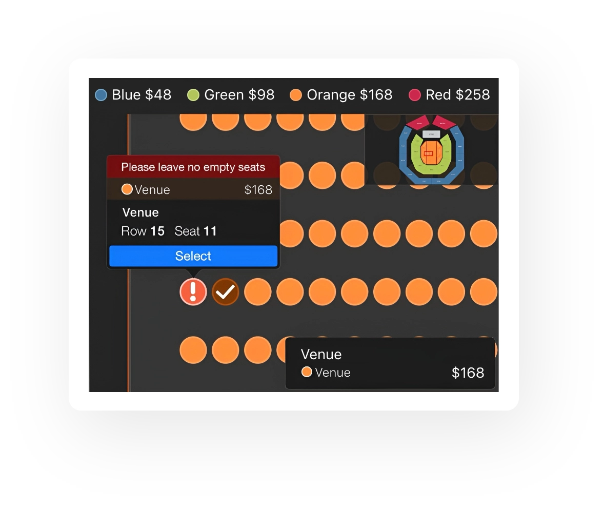 Allow attendees to quickly find the best available seats without manual browsing. This feature automatically assigns the best seats based on proximity to the stage or other desired areas, making ticket purchasing faster and more convenient.